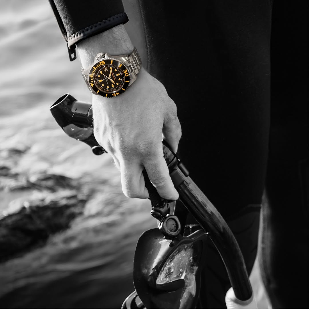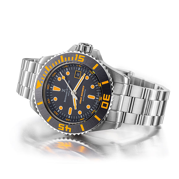 La Wave Breaker se distingue par son boîtier en acier inoxydable 316L brossé/poli, surmonté d’une lunette en céramique noire et d’index lumineux orange visibles en toutes circonstances. Son cadran noir apporte la touche d'élégance, tandis que le verre saphir anti-rayures protège durablement l’ensemble.